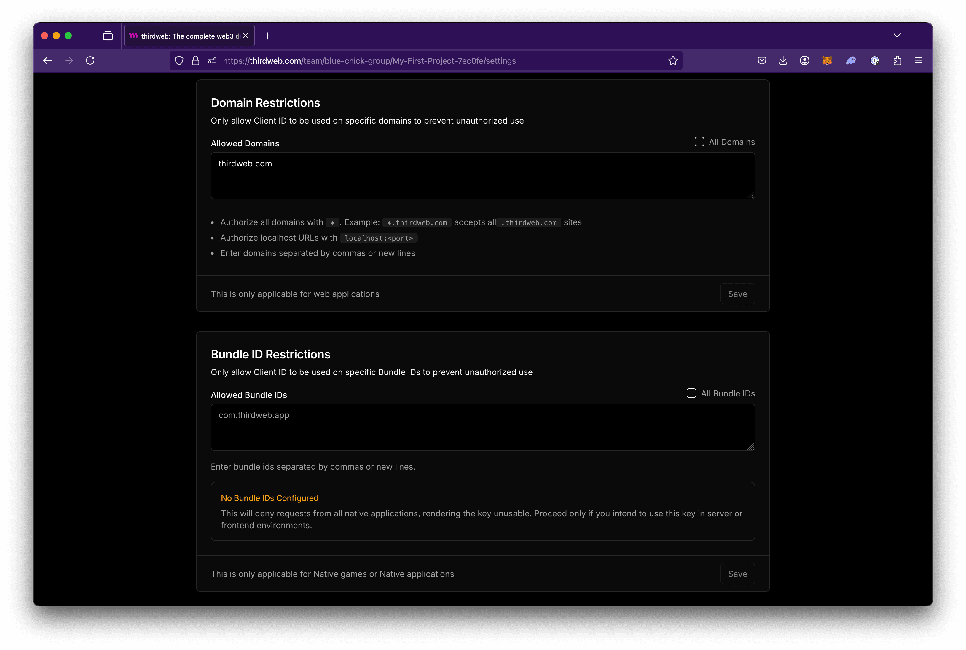 - Domain IDs: A domain ID is used to restrict access to the enabled thirdweb infrastructure services based on a specific domain. It serves as an identifier for websites.
