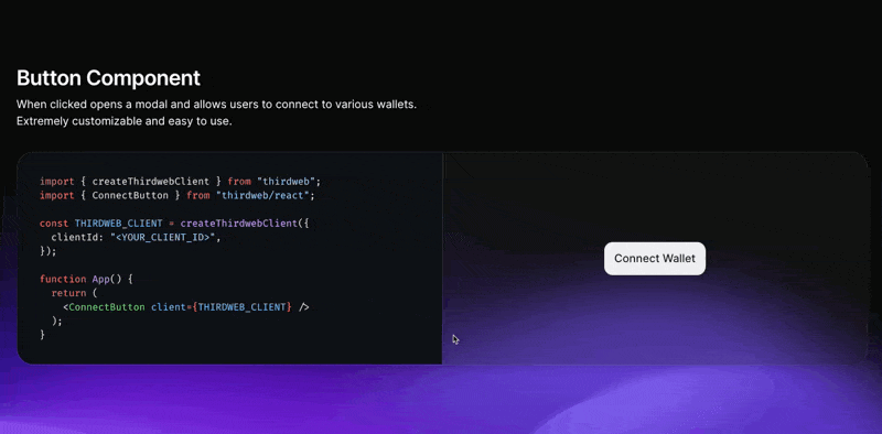 The easiest way to let your users connect to Coinbase Smart Wallet is using the ConnectButton or ConnectEmbed component. Easy to setup and highly customizable React components. Just drop it into your app and done.