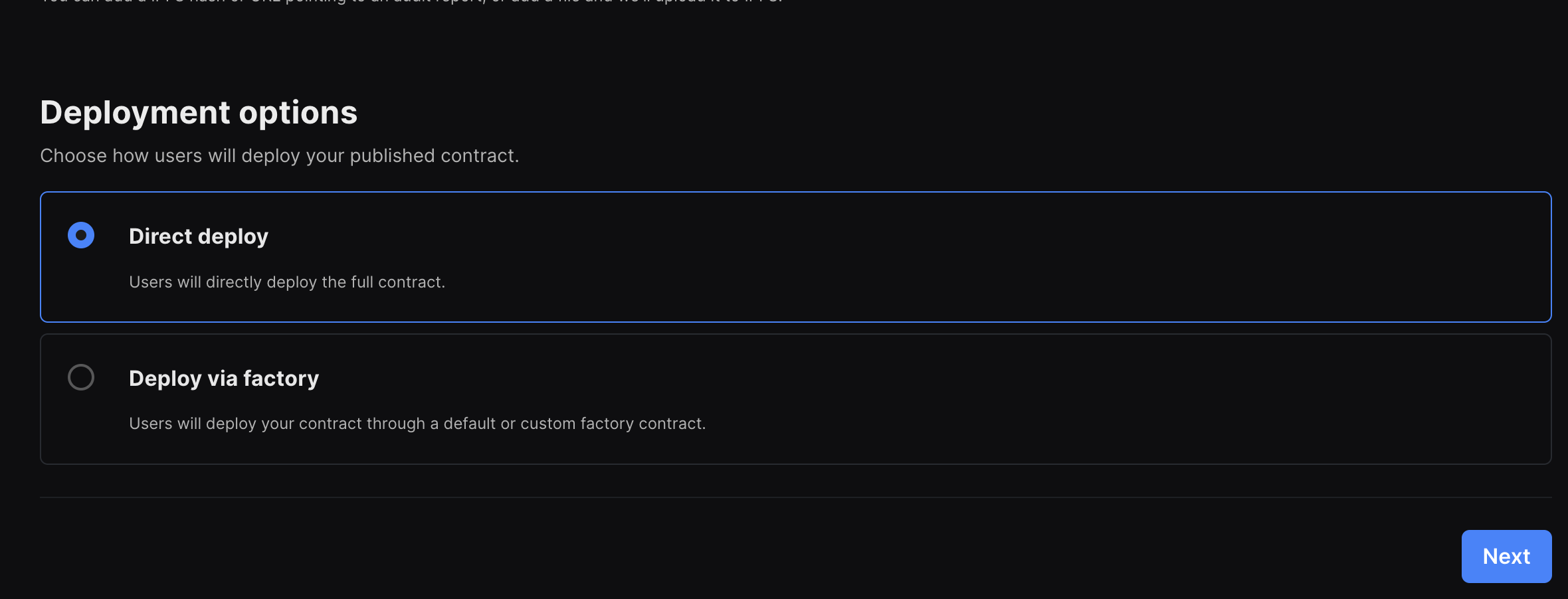To use this feature, you need to publish your contract as a direct deploy contract using thirdweb CLI. Under deployment options, select direct deploy as shown below: