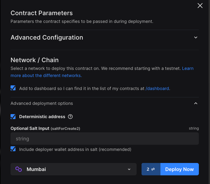Once the contract is published, you can deploy it from its publish page. In the deploy form, use advanced deployment options to enable deterministic deployment and provide salt input (if needed). It is recommended to use default settings as shown below: