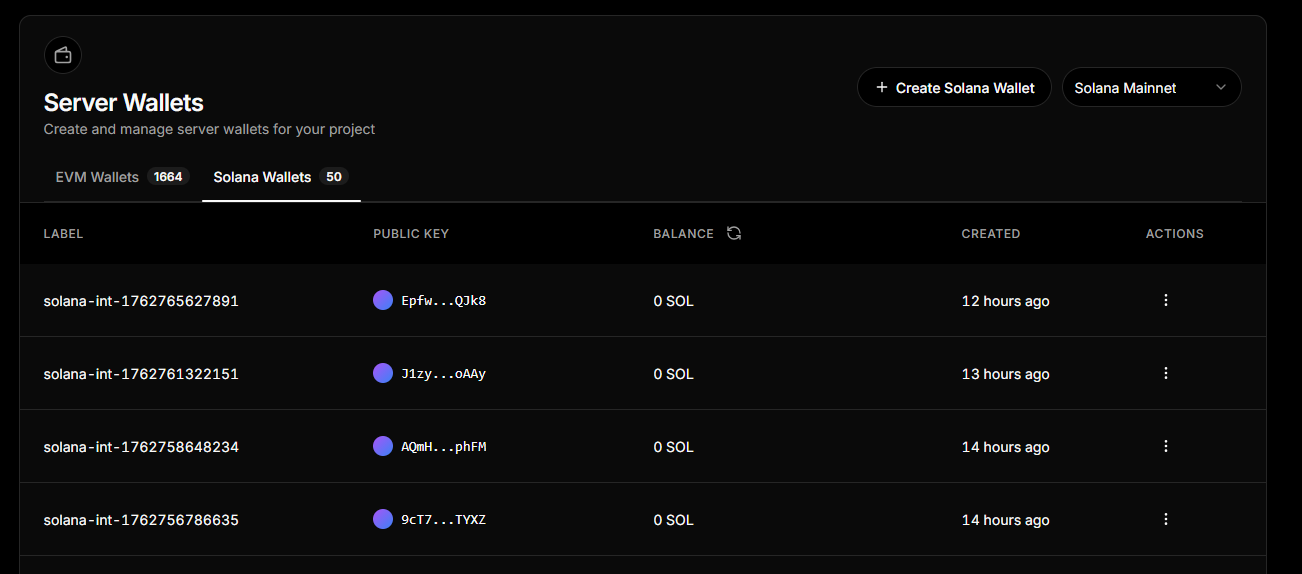 Similarly to User Wallets, you can view analytics about transactions made from your backend as well as the EVM and Solana server wallets you have configured. This was previously all of the UI from the Transactions tab.