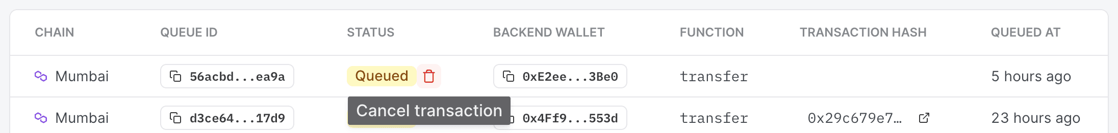 Select the Cancel icon next to a queued transaction in the Tranasctions table.