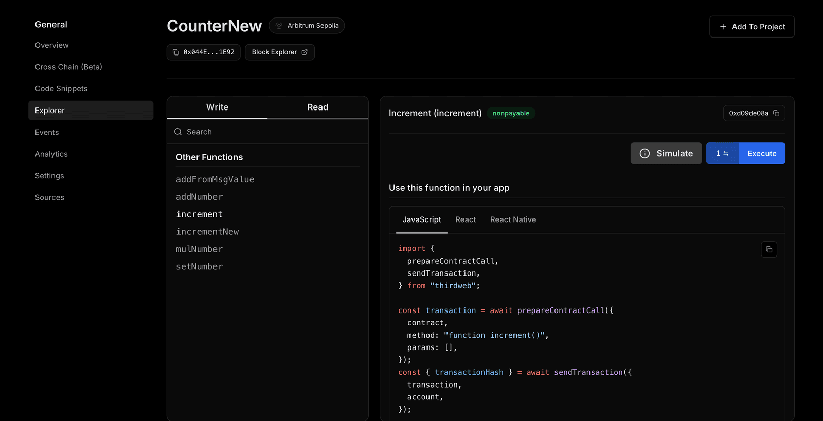 After deployment, the contract will be available on thirdweb dashboard. You can interact with it via dashboard or integrate it in your app using the code snippets as shown below: