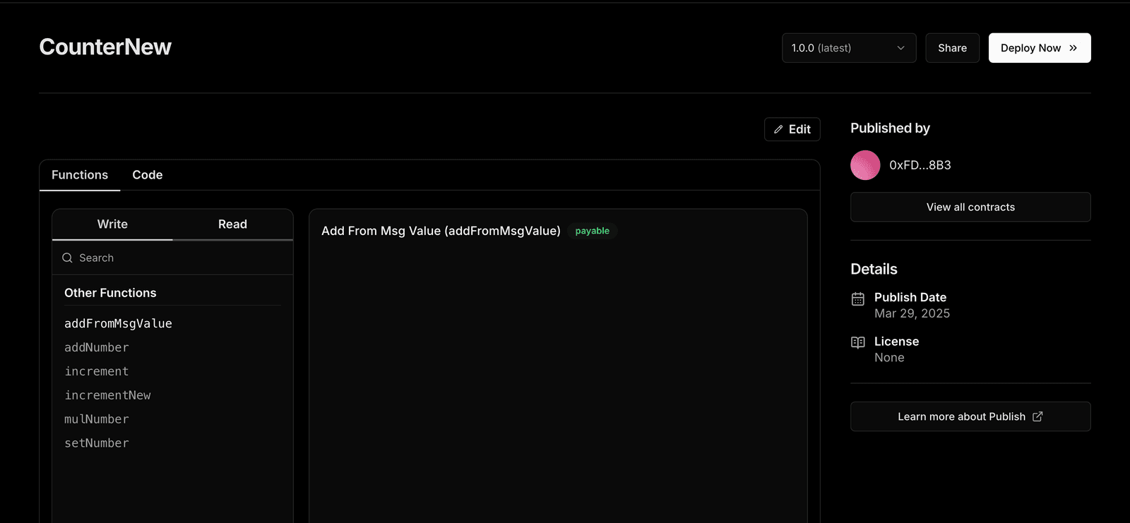 Publishing a contract saves the contract metadata to an onchain registry, and creates a contract page from where you can deploy a specific version of this contract multiple times.