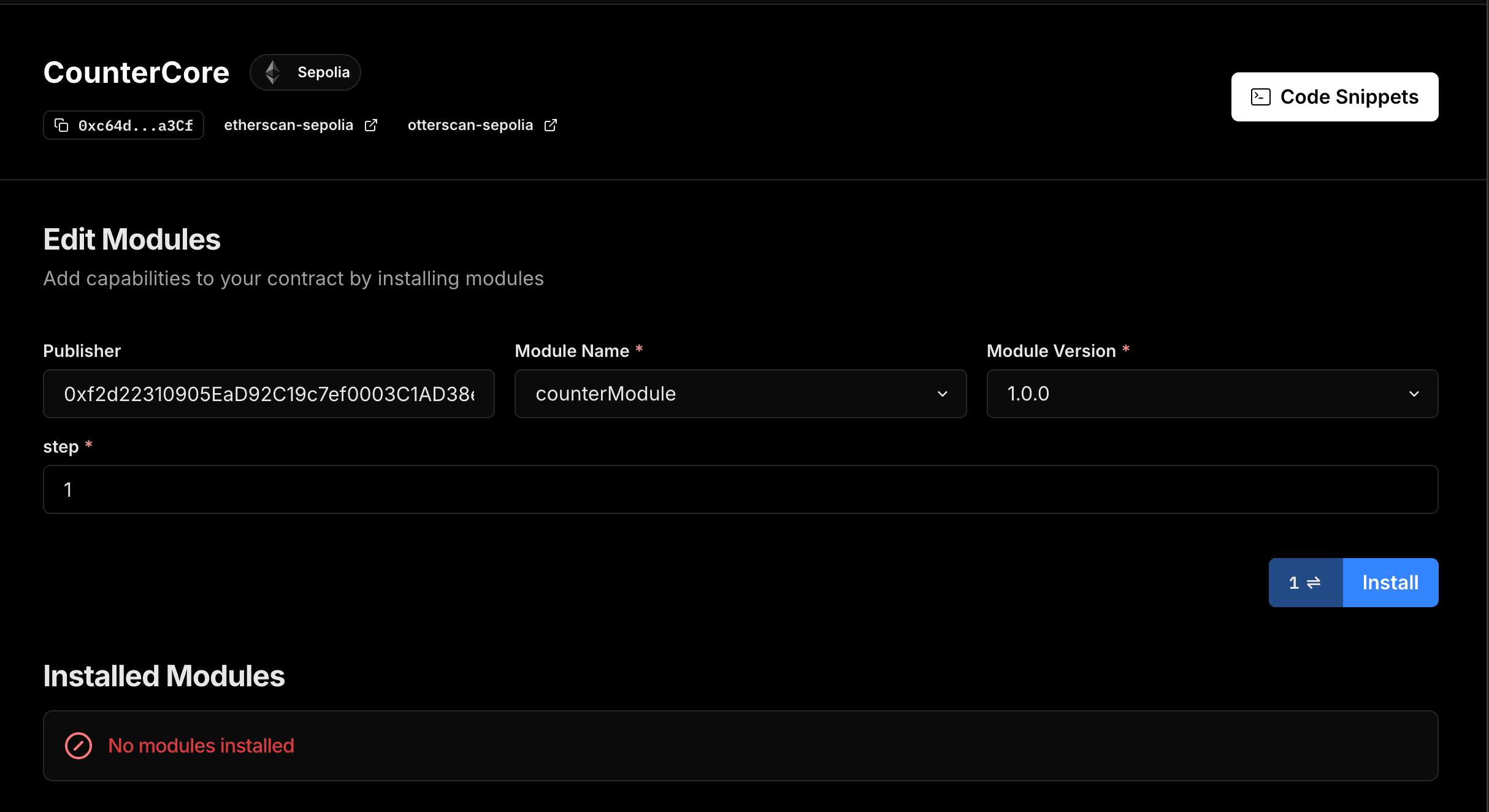 counterModule. Once it finishes checking eligibility, select "Module Version" as 1.0.0 and choose whichever step you wish to use.Finally, click "Install".