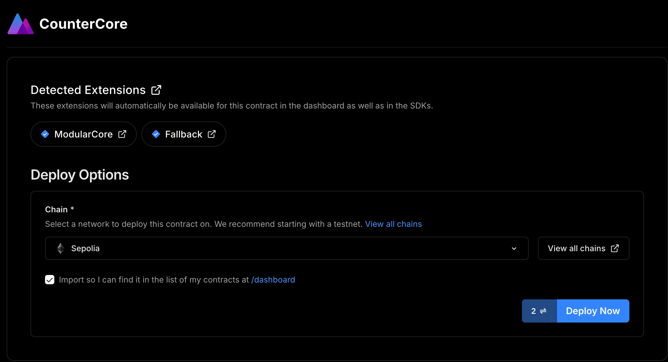 Then, choose the Sepolia chain and click "Deploy Now".