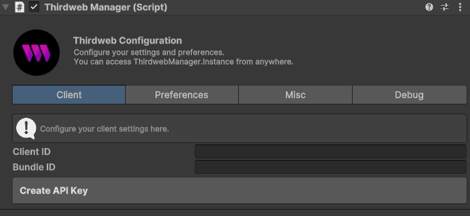 Client ID: Thirdweb API Key. Used to access thirdweb services such as RPC, Storage, and Account Abstraction.Bundle ID: The bundle ID used to access thirdweb services from native platforms. Should be the same as the bundle ID in your Unity project, e.g.,com.companyname.gamename.Create API Key: A link to create a new API key if you don't have one.