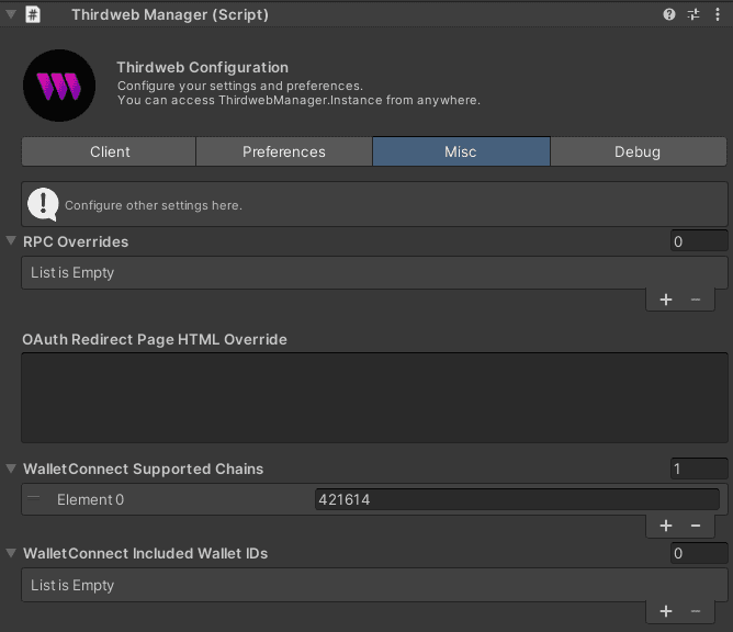 RPC Overrides: A list of RPC overrides to use when connecting to a chain. You can bypass using thirdweb's RPC that way (not recommended).OAuth Redirect Page HTML Override: Raw HTML to override the default redirect page when connecting toInAppWalletorEcosystemWalletproviders.WalletConnect Supported Chains: A list of chains that the wallets should be able to connect to by default when usingWalletConnectas a wallet provider.WalletConnect Included Wallet IDs: A list of wallet IDs that should be included in the WalletConnect modal by default (optional override).