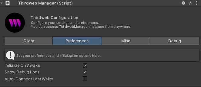 Initialize On Awake: Whether the SDK should initialize on awake or not. If not, you can callThirdwebManager.Instance.Initialize()to initialize it manually.Show Debug Logs: Whether to show thirdweb SDK debug logs.Auto-Connect Last Wallet: If enabled, we will automatically connect to the last connected wallet on initialization (this behavior does not apply to the WalletConnectWallet provider option). If a wallet was connected as a non smart wallet, then later upgraded, the smart wallet is saved as the last wallet, and the next session will autoconnect to the smart wallet. Any failure during this entire flow should not throw.