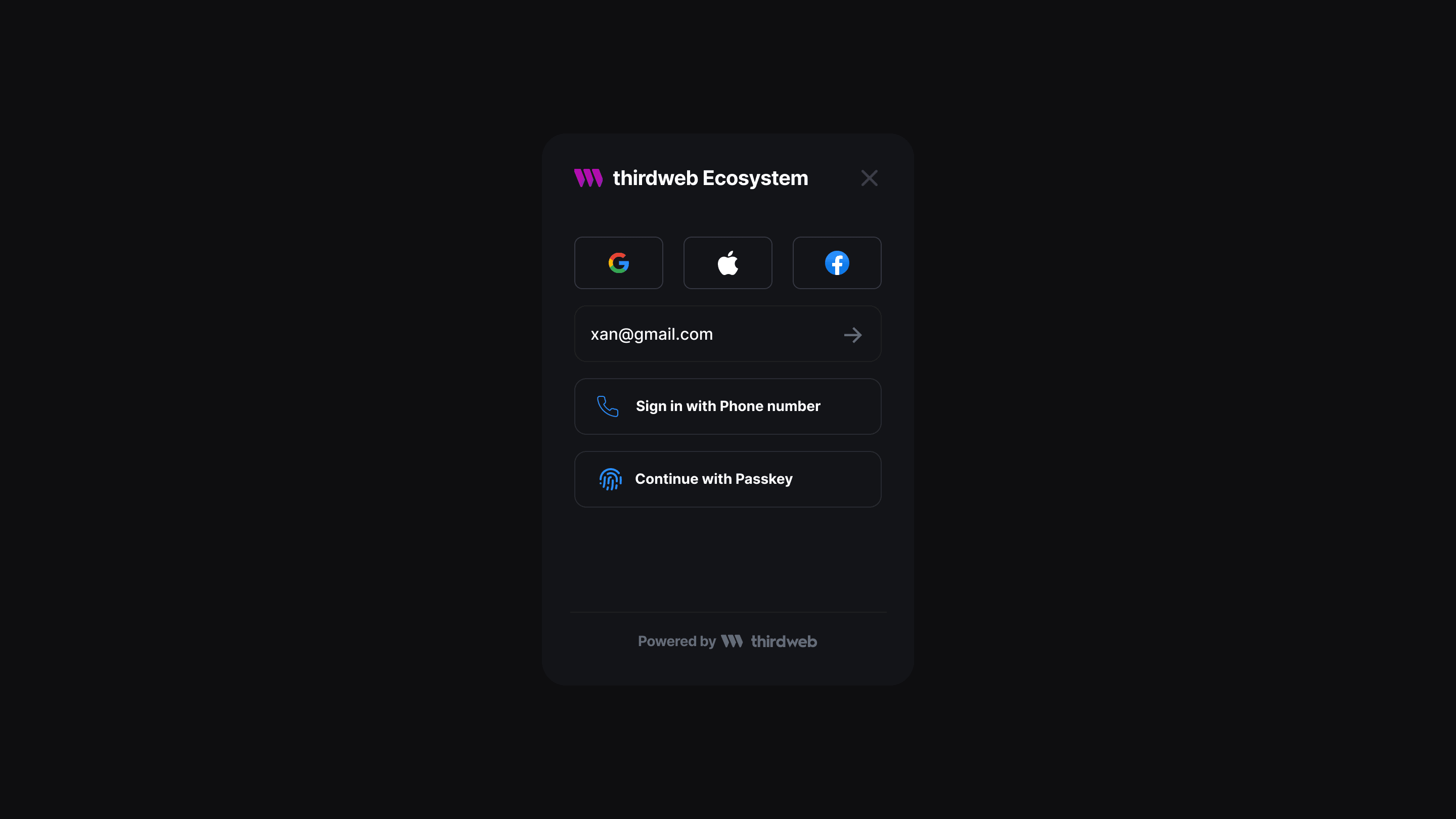 The Sign In UI provides a complete flow with email, phone, passkey, and social sign in options. Available social login options are determined by the ecosystem creator. Any options displayed in the sign in flow will create an in-app wallet within the specified ecosystem.